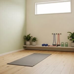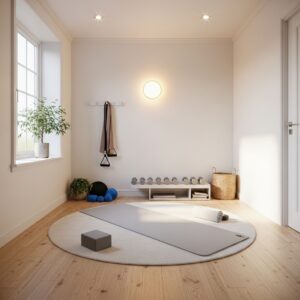 Set up a yoga corner with a mat, small plants, and calming wall colors.