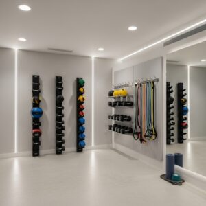 You can also hang jump ropes and resistance bands on hooks. This setup keeps the floor free and organized.