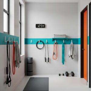 Install wall hooks to hang gym accessories like jump ropes, resistance bands, and towels.