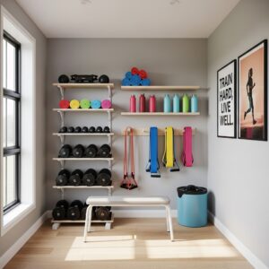 Use wall-mounted shelves to store small equipment like dumbbells, resistance bands, and water bottles.