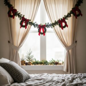 Swap your regular curtain tiebacks for Christmas-themed ones like garland strands, red velvet bows, small wreaths, or snowflake ornaments.