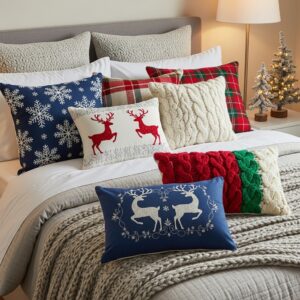 Swap your everyday pillows for Christmas-themed ones—snowflakes, reindeer, embroidered quotes, velvet trees, tartan patterns, or knitted textures.