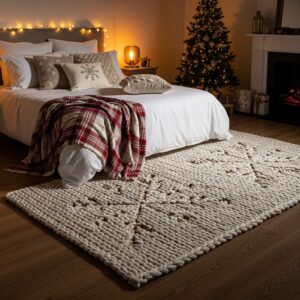 Swap your rug for a holiday-inspired one, such as a classic red plaid runner, a Scandinavian snowflake mat, or a chunky knit rug.