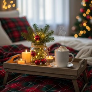 Place a wooden or bamboo bed tray on your comforter and style it with a mug of cocoa, pine branches, a small candle, or a tiny ornament tree.