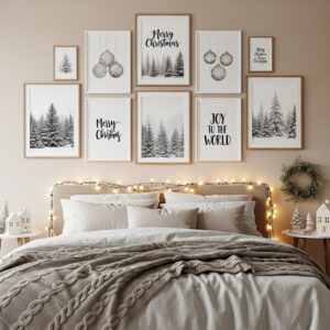 Replace regular wall art with Christmas-themed prints: winter forests, holiday quotes, watercolor ornaments, or nativity-inspired pieces.