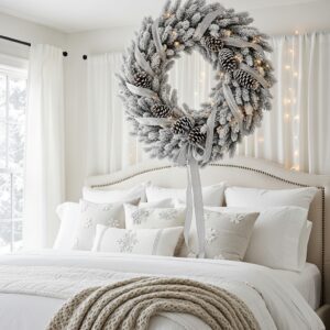Hang a flocked pine wreath above your headboard for a simple and elegant look.