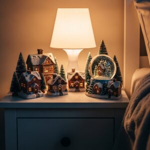 Decorate your nightstand with small trees, a snow globe, ceramic houses, or frosted pine branches.