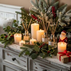 Choose candles or diffusers in Christmas fragrances like pine, cinnamon, peppermint, or vanilla cookie.