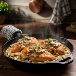 Tender chicken breasts smothered in a creamy garlic mushroom sauce make for an elegant, comforting dinner.