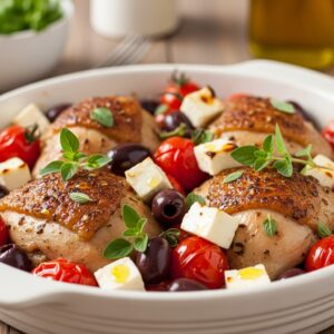 Arrange chicken in a dish and top with tomatoes, olives, and feta.