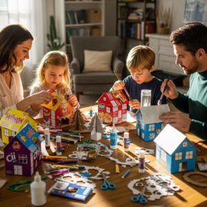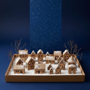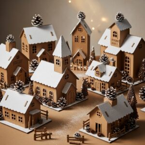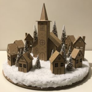 Design a central piece — like a cardboard church or clock tower — surrounded by smaller houses.