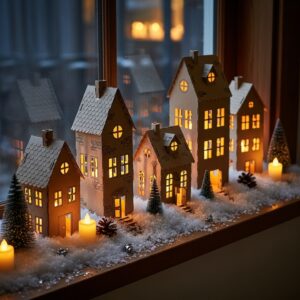 Make tiny cardboard houses with cutout windows, and place LED tea lights inside each one.