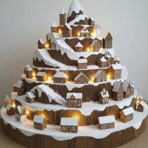 Place small houses on each level, decorate with cotton snow, and add LED lights behind them for a glowing mountain-town look.