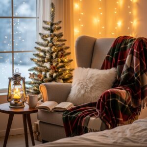 Create a holiday-themed reading corner with a soft chair, plaid blanket, floor lamp, and a tiny Christmas tree or lantern.
