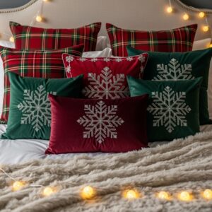 Add holiday-inspired throw pillows—buffalo plaid, embroidered snowflakes, velvet textures, or seasonal quotes like “Comfort & Joy.”