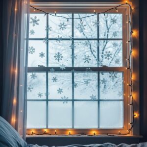 Add snowflake window clings, fairy lights around the frame, or frosted spray snow for a frosty winter look.