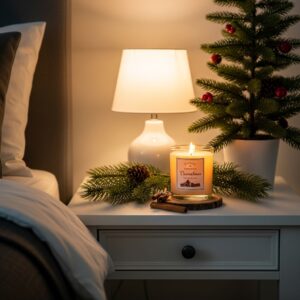 Decorate your nightstand with a mini tree, winter candle, pine sprigs, small wreath, or a tiered tray with ornaments.