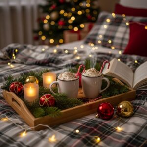 Place a wooden tray on your bed with festive accents like hot cocoa mugs, pine branches, candles, and ornament décor.