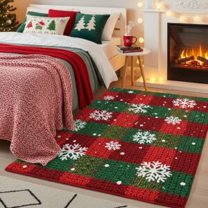 Add a holiday-patterned rug or doormat near the bed—something with winter motifs, tartan prints, or cozy knitted textures.