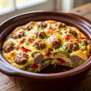 This breakfast casserole combines buttons, eggs, cheese, and sausage in the crockpot for a hearty morning meal.