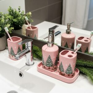 Pink soap dispensers, toothbrush holders, and trays with festive designs keep your space practical yet beautifully decorated for the season.