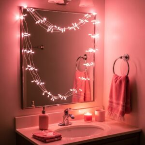 Finally, add a magical glow by draping pink fairy lights around your mirror or along a shelf.