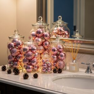 For a subtle yet elegant touch, place pink Christmas ornaments in clear glass jars or apothecary containers.