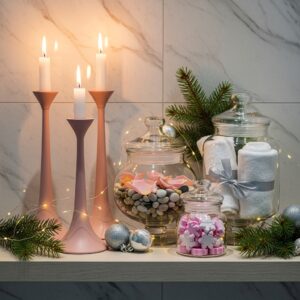 For your bathroom, choose pink candle holders or scented candles in holiday fragrances like peppermint, cinnamon, or vanilla.