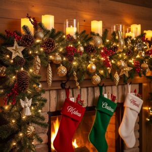 A well-decorated mantle creates a welcoming focal point where stockings hang, candles flicker, and garlands glow.