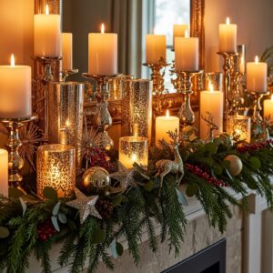 Layer them with greenery and ornaments for a luxurious, glowing mantle.
