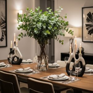 For centerpieces, stick with simple, sculptural designs such as ceramic bowls, minimalist candle holders, or a single oversized vase.