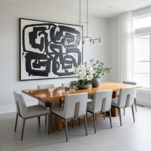 Large-scale abstract paintings, black-and-white photography, or minimalist line drawings work beautifully with this style.