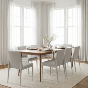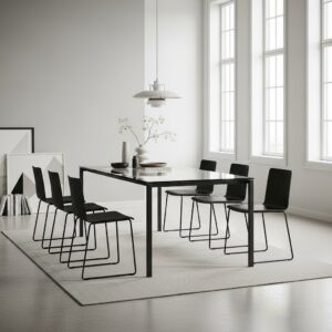 Opt for a dining table with clean lines, such as a rectangular wood or glass table, paired with chairs in neutral shades like black, gray, or beige.