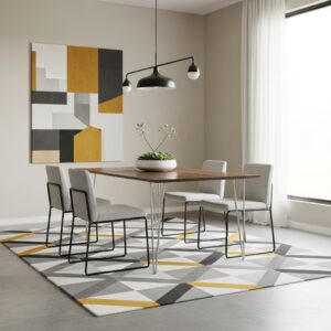 For a modern aesthetic, look for rugs with geometric patterns, subtle textures, or neutral colors that complement the dining set.