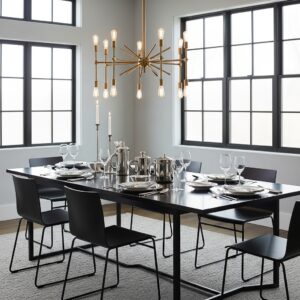 A brass chandelier, black steel dining chairs, and silver accents on tableware can create visual interest without overwhelming the space.