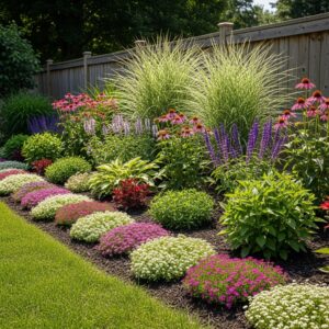 Start with taller shrubs or ornamental grasses at the back, medium-height perennials in the middle, and groundcover or annuals at the front.