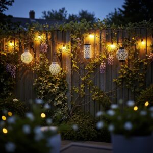 String lights, lanterns, or solar-powered LED fixtures can highlight plants, climbing vines, or even a decorative fence design.
