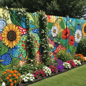 This works especially well for plain wooden fences that need a pop of personality. Consider botanical themes, abstract patterns, or seasonal designs.