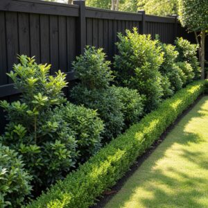 Planting evergreen shrubs or hedges along your fence ensures greenery throughout the year.