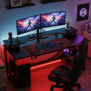 Choose a spacious desk with enough surface area for a large monitor or dual monitors, a gaming keyboard, and a mouse with extra room for snacks or game controllers.