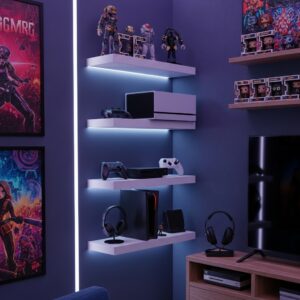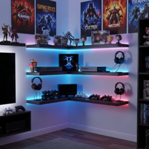 To keep the room clutter-free, install wall-mounted shelves for game consoles, headsets, collectibles, and figurines.