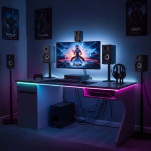 RGB LED strips around the room, smart bulbs, or backlighting behind the monitor can reduce eye strain and add a cool factor.