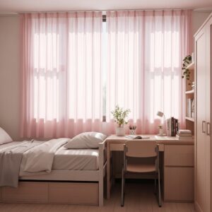 Light curtains make the room feel open, airy, and calm while adding a soft pink color.