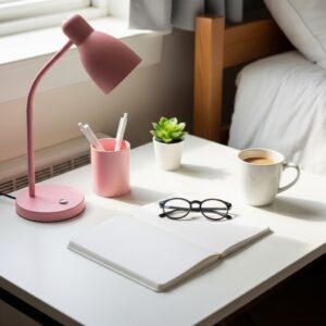 A pink lamp, a pen holder, or a small notebook can add a touch of color.