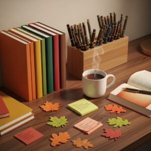 Choose notebooks in earthy tones, pens with wooden accents, or sticky notes shaped like leaves.