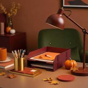 Switch out your everyday accessories—like pen holders, trays, or file organizers—for ones in fall tones. Deep reds, golds, and warm browns give your desk a seasonal refresh. Even swapping your desk lamp shade for a warmer color makes a difference.
