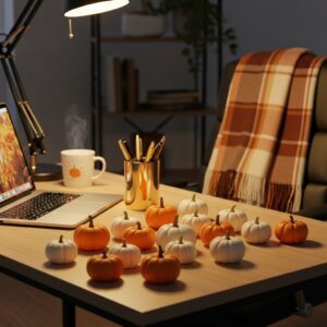 Place a few mini pumpkins on one side of your desk, or line them neatly on a shelf above your workspace.