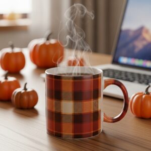 Think plaid prints, pumpkin graphics, or mugs in rich tones like burgundy or forest green.