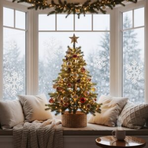 A 3–4 ft tree decorated with simple ornaments and twinkling lights adds instant holiday charm.
