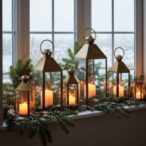Choose candles in various heights and styles — metallic gold, frosted white, or rustic wood — and add faux snow or pine branches around them.